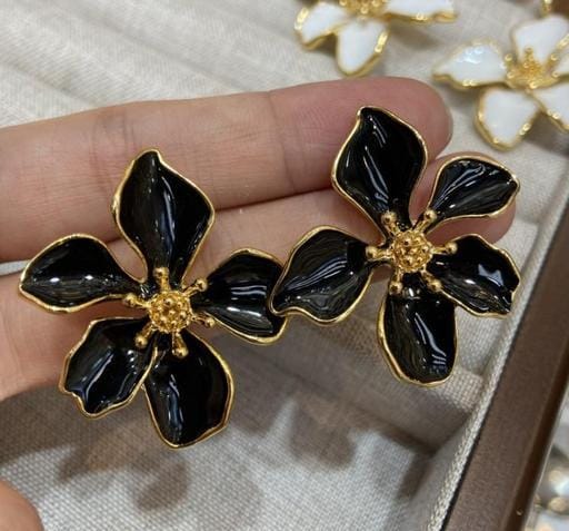 Black Floral Stud Earrings for Women | Korean Trendy Gold Plated Flower Earrings