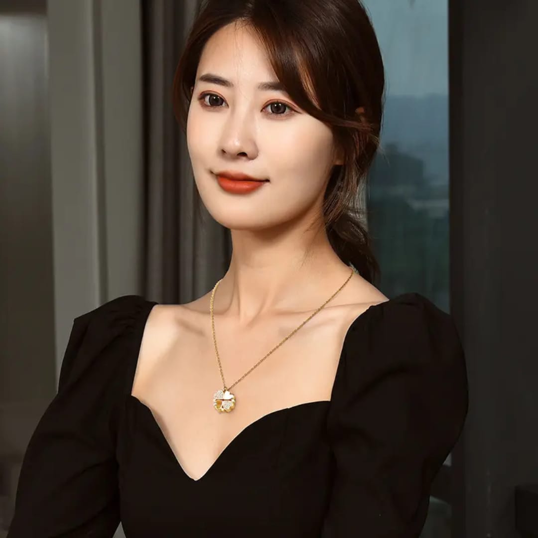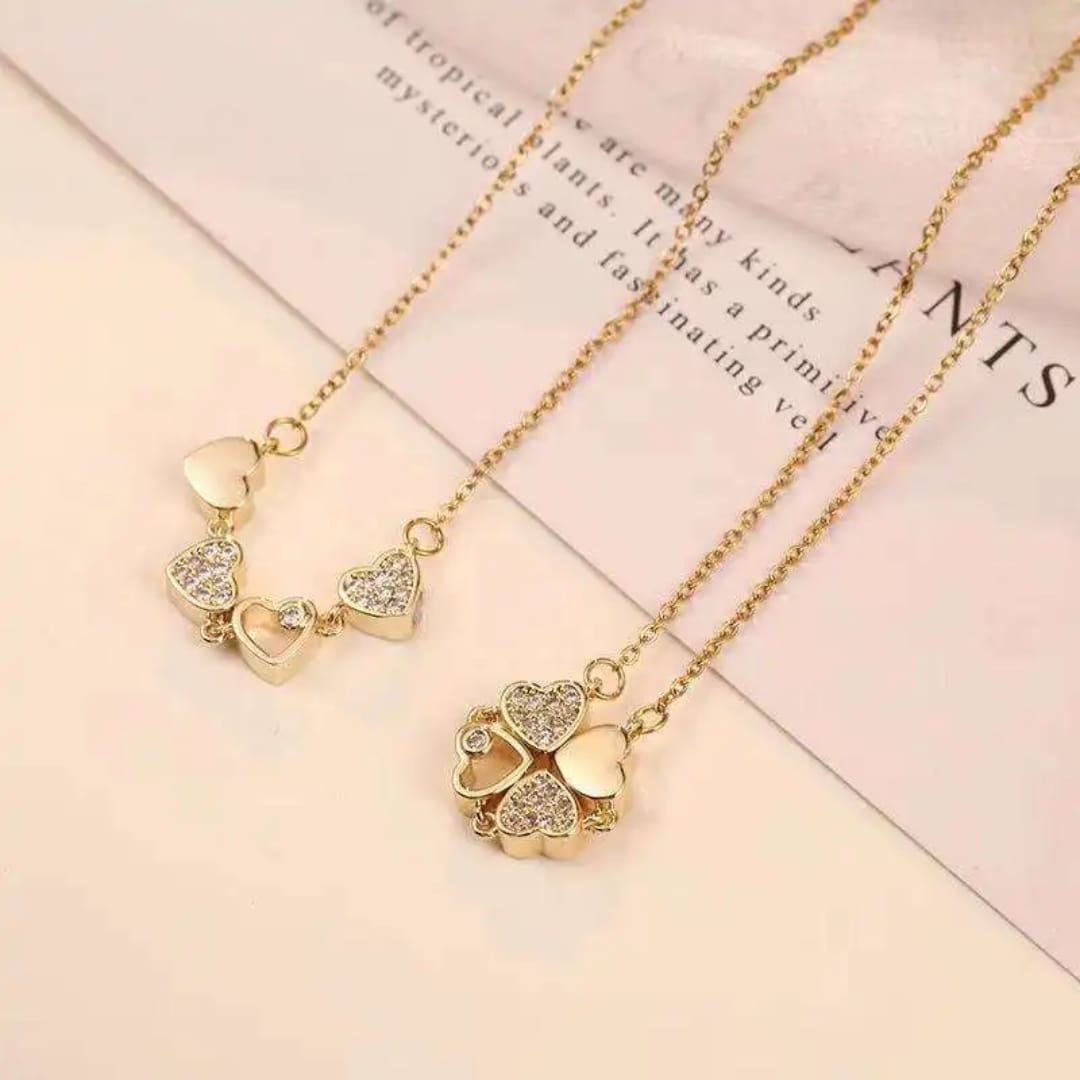 magnetic four-leaf clover heart necklace that is a popular, versatile piece of fashion jewelry. The innovative design features four individual heart-shaped pendants that can be magnetically connected to form a single lucky four-leaf clover motif.